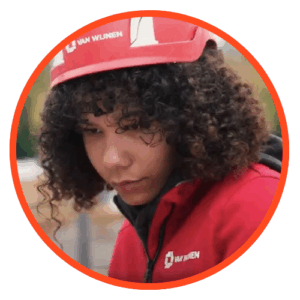 “Ik vind het fijn dat ik niet de hele dag achter een scherm hoef te zitten, dat past gewoon niet bij mij. In de bouw kan ik met mijn handen werken, creatief nadenken en echt iets maken. De sfeer op de bouw is vaak relaxed. Mannen zijn direct, er wordt weinig geroddeld en het is gezellig. Ik vind het ook gewoon grappig om met die “lompe mannen” samen te werken. Dat maakt het werk leuk.”